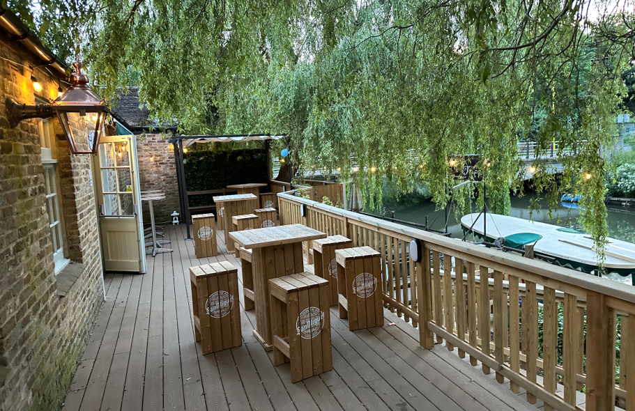 Our private terrace, attached to the barn & boat ramp, where guests can flow & gather, overlooking the flowing river and magical draping willow trees, offering a serene and naturally beautiful setting with a greenery backdrop and light up feature.